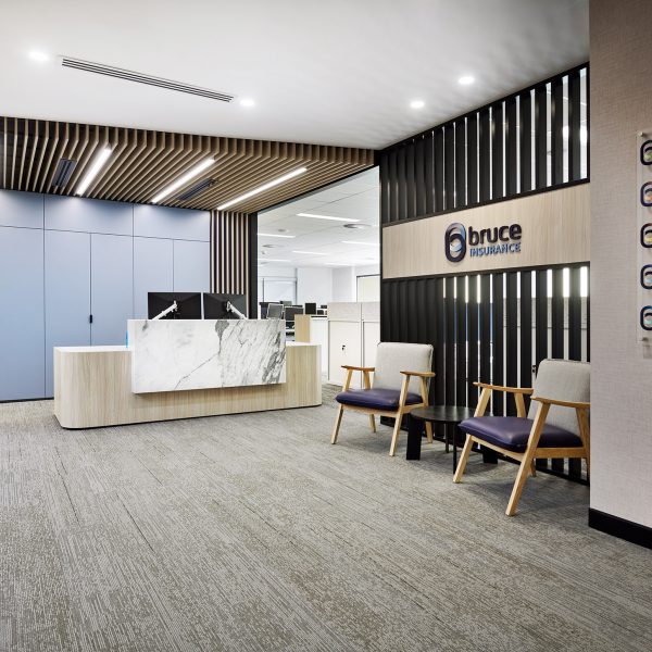 With limited access and noisy works restrictions, works included creation of new female amenities and unisex shower room, welcoming Reception with Supawood Supaslat ceiling, sleek joinery with stone benchtops, glazed partitions and frosted decals, perforated acoustic plasterboard ceiling boardroom, quality carpet and vinyl flooring, painting and window treatments. Services included soundmasking, electrical, mechanical, hydraulics and AV.
