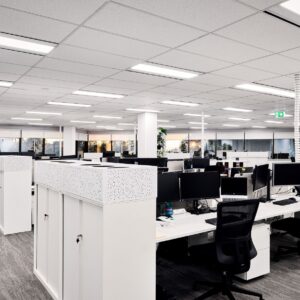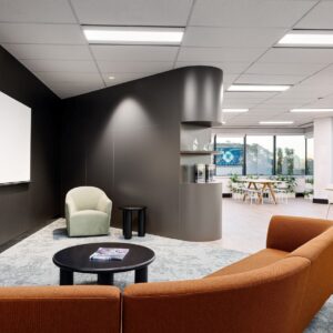 Scope of works included refitting of floor including integration with existing offices, electrical, mechanical, hydraulic, audio visual, security integrated with base building requirements, painting, tiling, soundproofing, glazing decals, part glazing replacement to front of house, loose furniture, acoustic panels, reworking of existing grid ceilings, install of flush plasterboard ceiling, partitions, joinery and window treatments.